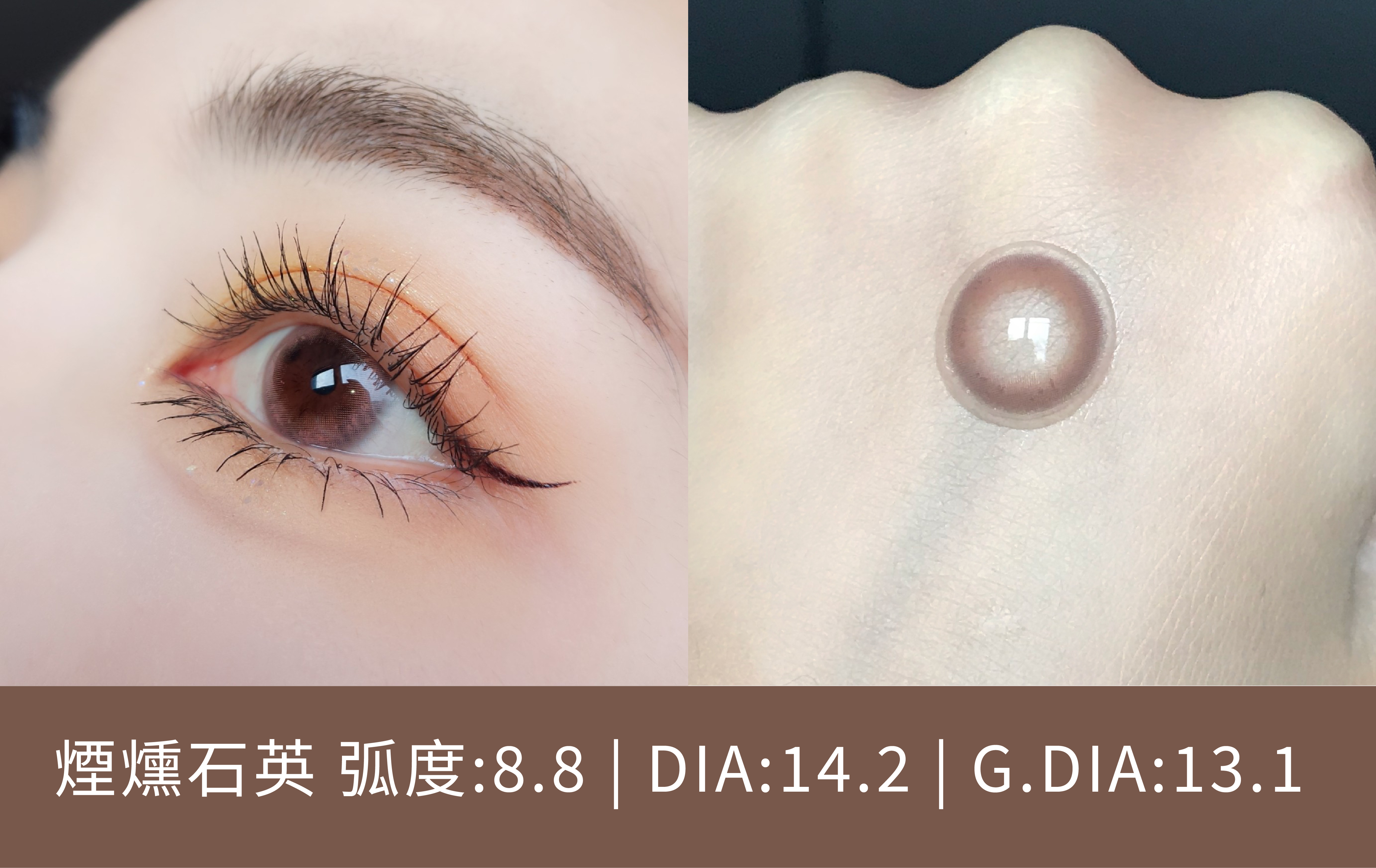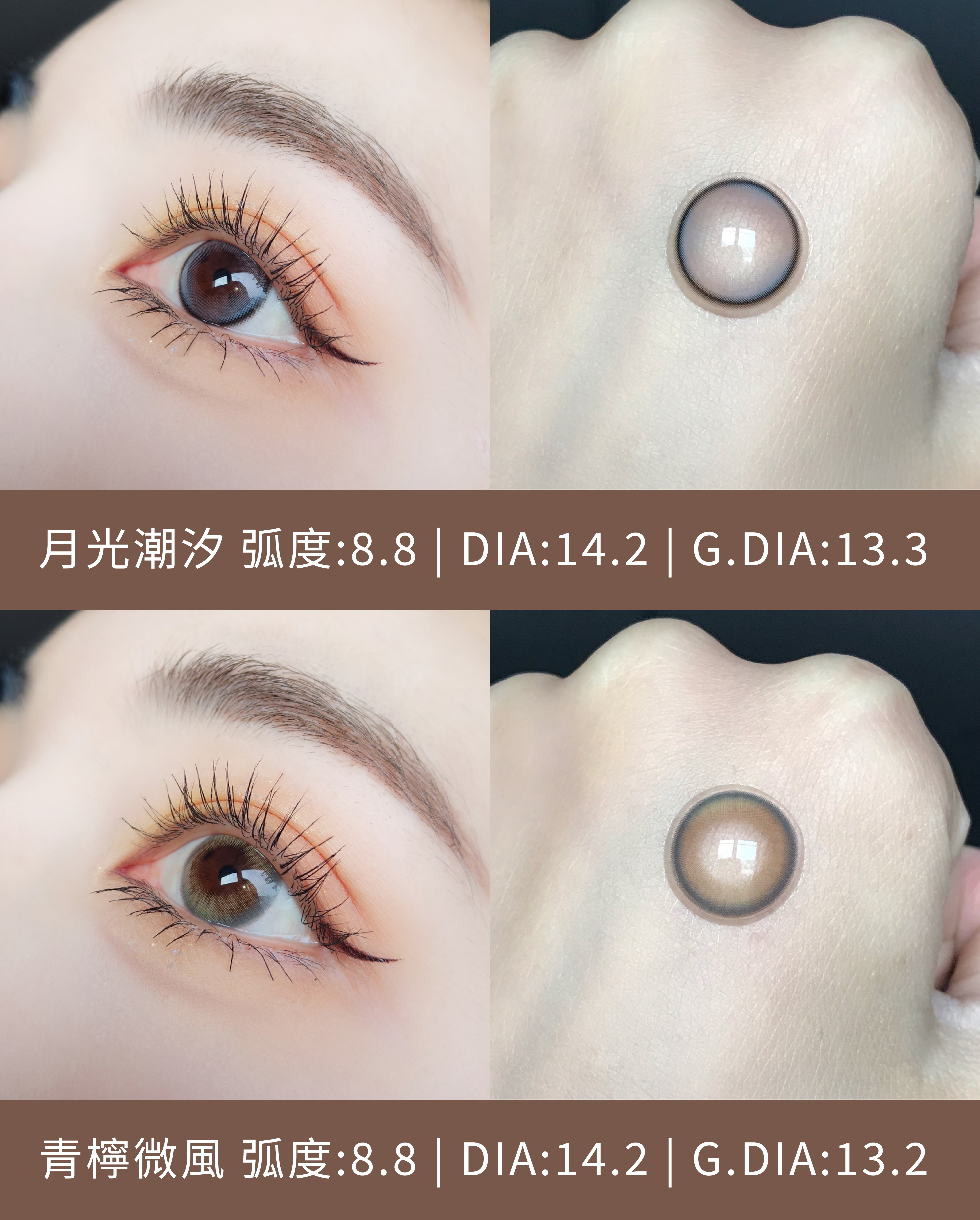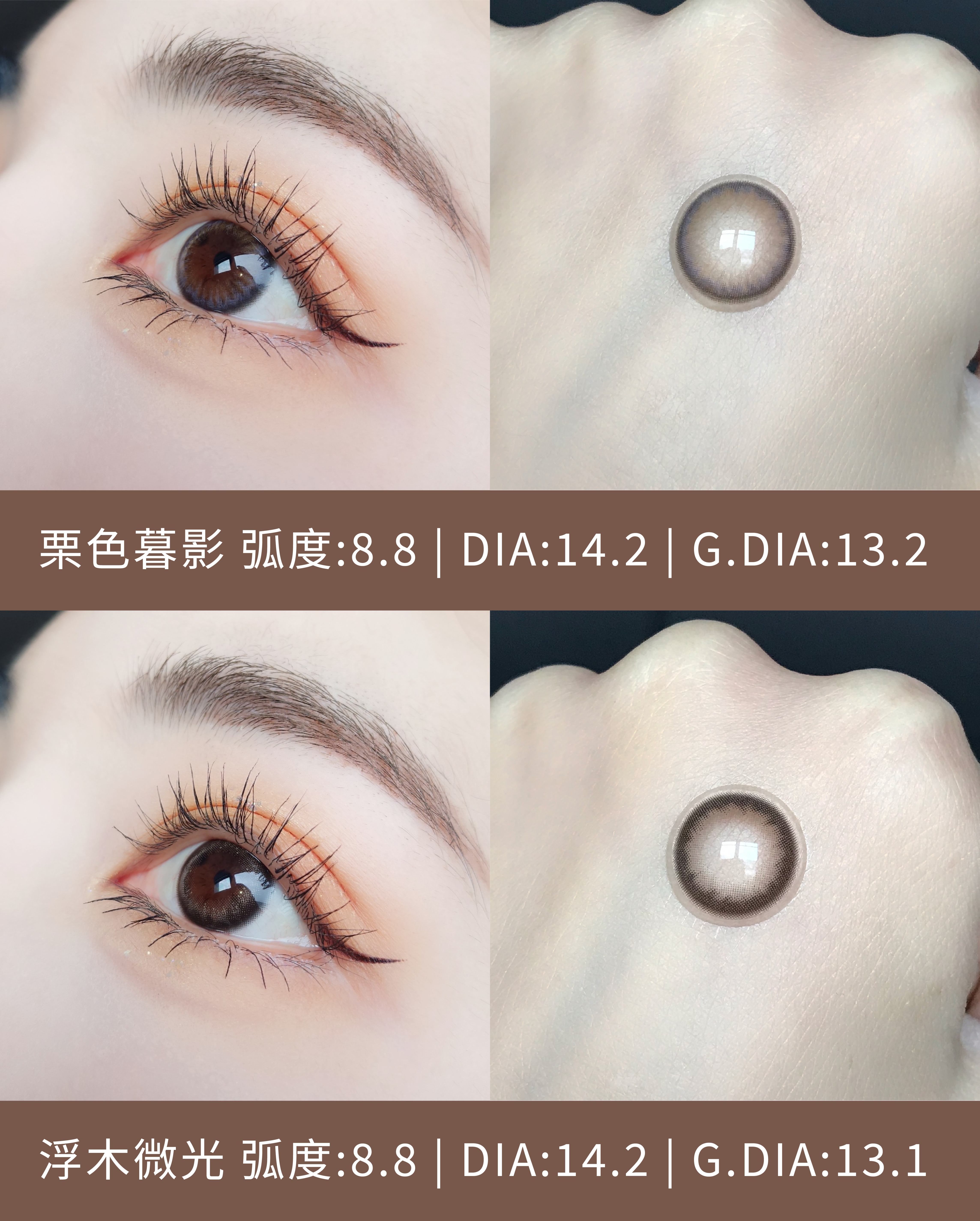 浮木微光是五款裡最安全百搭的大地棕,是那種誰戴都不會出錯的色系。近看咖啡色帶一點透明感,不死黑,遠看眼睛像上了柔焦